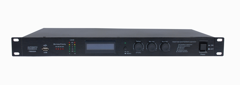 FB8000A:功能包含八路混音、反饋抑制、均衡、自動壓限、幻象電源,支持中控、 話筒部分可以任意切換錄音輸出; 一、產(chǎn)品功能特點: 1):2個通道音樂輸入,8路麥克風(fēng)輸入。2X16藍(lán)色LCD屏顯示 2):本機(jī)內(nèi)置48V幻象電源,后面板帶總幻象開關(guān),(話筒1~4有四選一功能,話筒5/8直通話筒7/8 48V幻象電源自帶開關(guān)可以單獨選擇接無線麥克風(fēng)) 3):本機(jī)具有高、低音調(diào)節(jié)和增益調(diào)整功能。 4):話筒自動四選一:在發(fā)言者講話時,可任意選擇其中一只或多只話筒開啟,離發(fā)言者遠(yuǎn)的話筒將自動音量關(guān)閉,其作用是:a:減小外界環(huán)境噪聲經(jīng)話筒傳送到揚(yáng)聲器而產(chǎn)生的噪音,有利于會場的安靜和發(fā)言者語音的清晰度。b:減小由揚(yáng)聲器發(fā)出的聲音二次傳入話筒形成正反饋而產(chǎn)生嘯叫的條件。 5):自動壓限器功能:本機(jī)帶自動自動壓限器,通過COMPRESS調(diào)整總輸出電平。在多話筒同時使用時, 可防止因整體系統(tǒng)的增益上升,而產(chǎn)生的回饋。 6):反饋抑制功能:采用自適應(yīng)環(huán)境嘯叫抑制算法,內(nèi)置24Bit A/D、D/A轉(zhuǎn)換;24位DSP處理器,48KHz高速采樣。采用高速浮點數(shù)字音頻處理器和先進(jìn)的子帶(Sub-Band)回聲消除(Echo Cancellation)技術(shù),可高速全自動完全消除嘯叫和回聲,同時讓現(xiàn)場音頻精準(zhǔn)清晰實時送出. 可以通過“FSC/BYPASS”切換。 7):內(nèi)置自適應(yīng)動態(tài)噪聲濾波器,可濾掉現(xiàn)場環(huán)境的背景噪聲但不影響語音信號高質(zhì)量的傳送。系統(tǒng)智能電平控制技術(shù),可以獲的到清晰、持續(xù)的、信號電平無明顯波動的語音信號。內(nèi)置AGC雙向控制,具有區(qū)分加強(qiáng)信號和輕柔信號的能力, 8):鍵盤上鎖功能:當(dāng)管理員將設(shè)備調(diào)試完后,再將面板按鍵鎖住,防止非管理員進(jìn)行操作。 9):全自動化操作的工作方式,免人工調(diào)試,無論房間環(huán)境中位置、溫度、濕度、 裝飾的改變,系統(tǒng)安裝都無需進(jìn)行聲場調(diào)試,精準(zhǔn)可靠使用簡單。 10):內(nèi)置10段圖示均衡器:輔助調(diào)節(jié)音色和反饋嘯叫點. 11):8路切換話筒錄音輸出切換開關(guān),開關(guān)OF時該路話筒沒有輸出. 12):本機(jī)帶平衡輸出和一組輔助錄音輸出。 13):各自適應(yīng)反饋抑制功能可通過本機(jī)USB連接電腦設(shè)置.支持中控調(diào)節(jié)