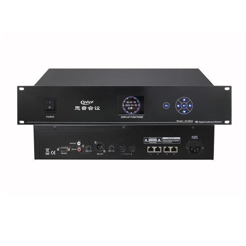 1.主機自帶2.8寸高清彩色液晶顯示屏,獨立按鍵操作,簡單明了。 2.主機在等待操作期間,會自動切換到高清時鐘界面,實時顯示當(dāng)前時間。 3. 采用數(shù)字集成電路技術(shù),內(nèi)置高性能CPU,低功耗、高保真、極穩(wěn)定; 4. 主機同時具有4路網(wǎng)線接口和2路八芯接口,用于連接會議單元。 5. 七種發(fā)言人數(shù)可選:1-6(人可選 )、N(全開放)。 6.具有限時發(fā)言功能,可設(shè)定發(fā)言人的發(fā)言時間,到時自動關(guān)閉話筒。 7.多種發(fā)言模式:先進先出模式、主席專用模式、全開放模式等。 8.斷電智能記憶功能,可記憶程序原運行狀態(tài)。若意外斷電后,通電即恢復(fù)最后一次設(shè)置; 9.具有中/英文語言切換功能; 10.主機可連接80個會議話筒單元,增加擴展主機最多可以連接512個會議單元。 11.具有聲控開咪功能,發(fā)言人不需要在發(fā)言前進行任何操作,會議單元在識別到有聲音輸入時,自動開啟。 12.具有輔助輸入輸出功能:輔助輸入可連接如手機、電腦等外部音源,輔助輸出可連接外部錄音設(shè)備或把聲音輸出給遠(yuǎn)程視頻會議終端。 13.輸入輸出的音量大小可調(diào)節(jié)。 14.具有RS-232接口,可連接中控系統(tǒng)或電腦,支持232協(xié)議代碼控制,令會議設(shè)備智能化。 15.具有雙重防雷功能,能在一定程度上防止雷電引起的電涌對系統(tǒng)主板的損壞。
