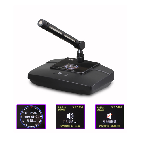 1. 單元采用2英寸高清彩色液晶顯示屏,等待操作期間,會自動切換到高清時鐘界面,實時顯示當(dāng)前時間。 2. 發(fā)言期間,顯示屏?xí)@示已發(fā)言時間,限時發(fā)言時,發(fā)顯示剩余可發(fā)言時間。關(guān)閉發(fā)言后,會顯示靜音標(biāo)志,和“發(fā)言請按鍵”指示。 3. 每一個會議單元有一個唯一的編號,支持中控設(shè)備用平板電腦控制打開和關(guān)閉發(fā)言狀態(tài),方便集中管理會議進程,讓會議室更智能化。 4. 專業(yè)高保真電容咪芯,拾音靈敏、語音清晰,帶寬達(dá)到20Hz~20KHz 5. 采用防干擾電路設(shè)計,可防止手機等電子產(chǎn)品的干擾。 6. 會議桿頭部帶發(fā)光燈圈,可顯示單元發(fā)言、關(guān)閉狀態(tài)。 7. 單元為無源設(shè)備,由系統(tǒng)主機供電。輸入電壓為24V,屬安全范圍。 8. 單元由1.5M*2M T型8芯線及超六類網(wǎng)線連接,線材采用全線鋁箔、水線屏蔽,大大降低強電磁波對線材的干擾。 9. 帶聲控啟動功能,發(fā)言時話筒單元電源自動打開(需要主機開啟此功能)。 10. 支持多個主席單元,連接時不受位置限制可任意安裝,具有全權(quán)控制會議秩序的優(yōu)先功能,可控制會議氣氛。 11. "手拉手"電纜串聯(lián)連接模式,便于安裝和維護。萬一某個單元損壞也不會影響其它單元使用。 12.主席單元擁有優(yōu)先發(fā)言權(quán)限,可以隨時打斷代表單元發(fā)言。