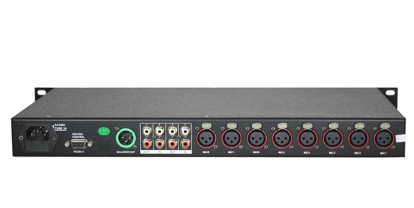 本產品為新一代多功能8路數字會議混音器。在傳統的混音器功能上獨創了會議系統功能,更具備人性化LCD和PC軟件操作界面,其中PC操作支持免驅USB連接。適合中小型會議室,多謀體教學室,法院庭審。 本產品支持8路獨立的混音,聲音處理采用專用音頻處理IC,聲音清晰,無雜音,整體信噪比高。每路支持獨立的幻象電源控制,聲音大小調節,聲控靈敏度調節,優先級調節,發言時間調節,更支持常開和禁止功能,以適應某些特定場合。 會議功能支持發言人數,限制模式,隊列順序和優先模式設置,可自由組合。 系統具有反饋降噪功能,可自由打開或關閉(依機器型號而定),打開后拾音距離可達到50cm;系統支持豐富的中控功能。 輸入電源電壓:220V(+-10%) 功率:<50W 單路話筒幻象電源(輸出):48V(+-1V) 信噪比:>85dB 失真度:<0.5% 通道分離度:>95dB 單路話筒頻響:70Hz---18kHz 單路話筒輸入阻抗:1K歐姆 聲控靈敏度:-47dB---0dB(48級可調,0為關閉,衰減>95dB) 單路話筒音量調節:-47dB---0dB(48級可調,0為關閉,衰減>95dB) 音量總輸出:-47dB---0dB(48級可調,0為關閉,衰減>95dB) 音量總輸入:-47dB---0dB(48級可調,0為關閉,衰減>95dB) 平衡輸出阻抗:1K歐姆 不平衡輸出阻抗:1K歐姆 不平衡輸入阻抗:3.9K歐姆 6.3輸入阻抗:3.9K歐姆 中控接口:支持,RS232C母 USB(TypeB母)控制:支持(免驅) 電路話筒觸發電壓:<100mV 單路話筒打開時間:<350uS 單路話筒延時時間:1-999S 尺寸:48.1cm(W)X4.8cm(H)X25.9cm(D) 凈重:3.45Kg